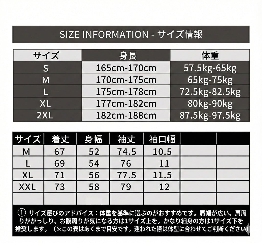 ※肩幅が広い方、ゆとりを持って着用したい方は1サイズ上、細身の方は1サイズ下もご検討ください